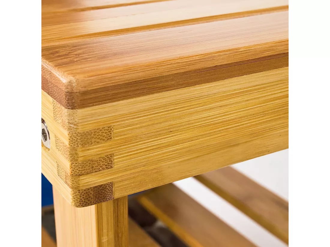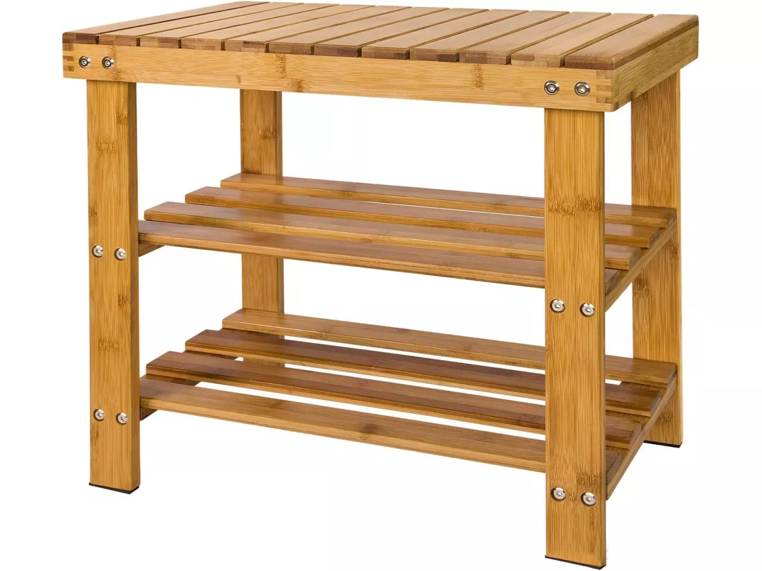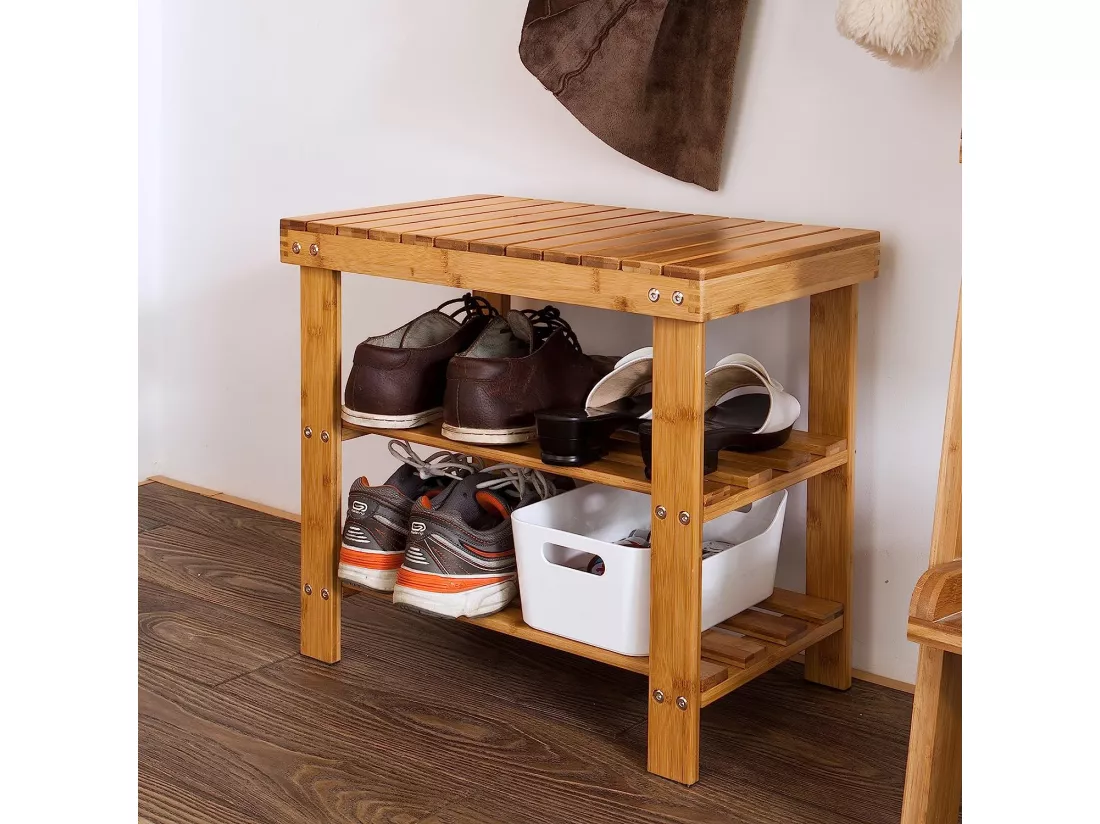 Ce porte-chaussures en bambou naturel , en plus de sa capacité de rangement, peut être exploitée comme assise banc.