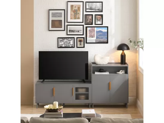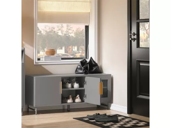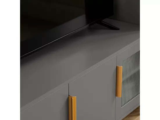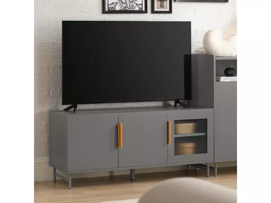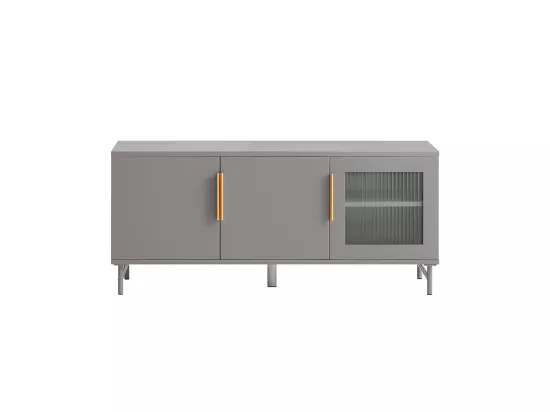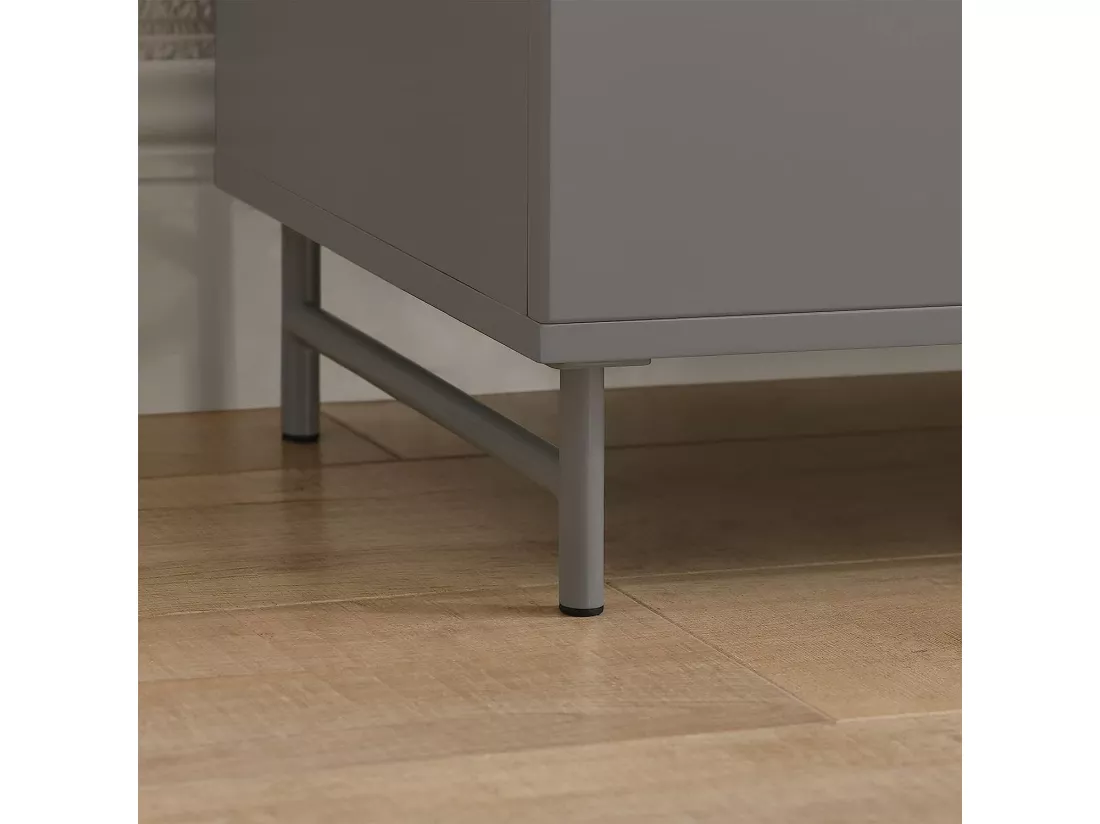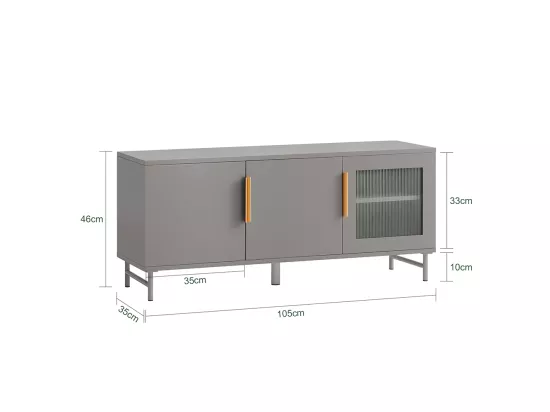 – Matériau : MDF (E1) laqué gris, verre, métal (poignées et pieds).
