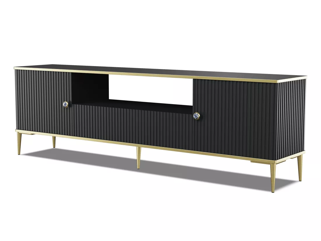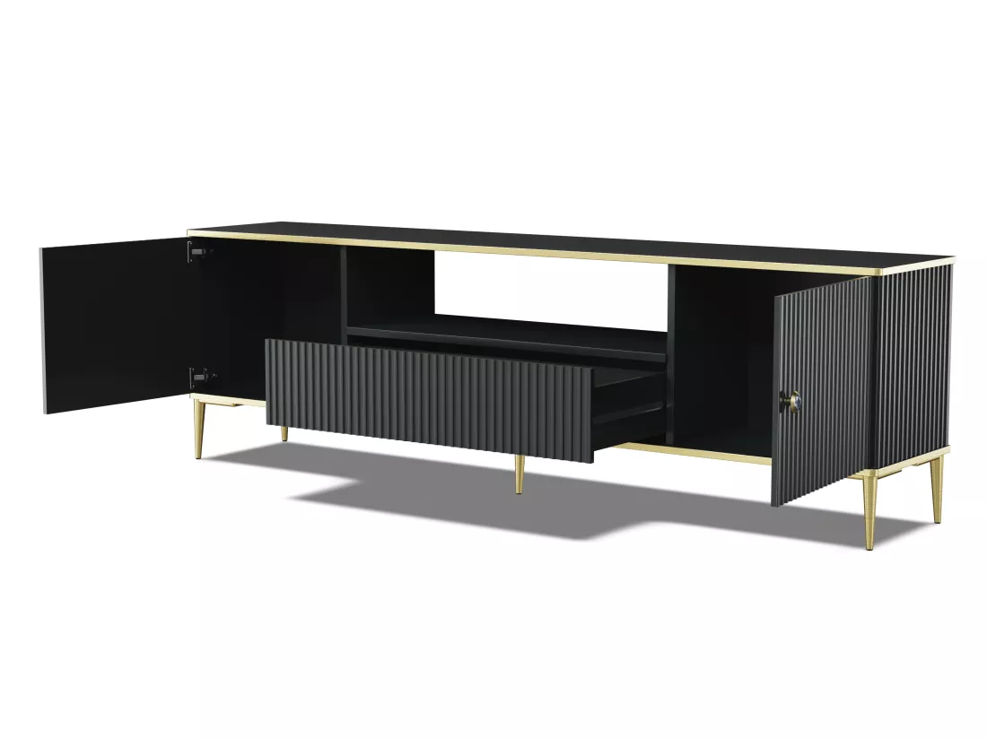 Le meuble TV a été conçu de manière à faciliter le rangement pratique des équipements électroniques. Une étagère ouverte est l’endroit idéal pour un décodeur, une console ou des objets que vous souhaitez exposer. Les accessoires peuvent également être rangés dans un tiroir spacieux ou des armoires latérales.