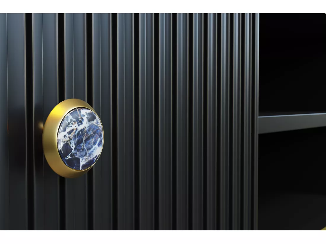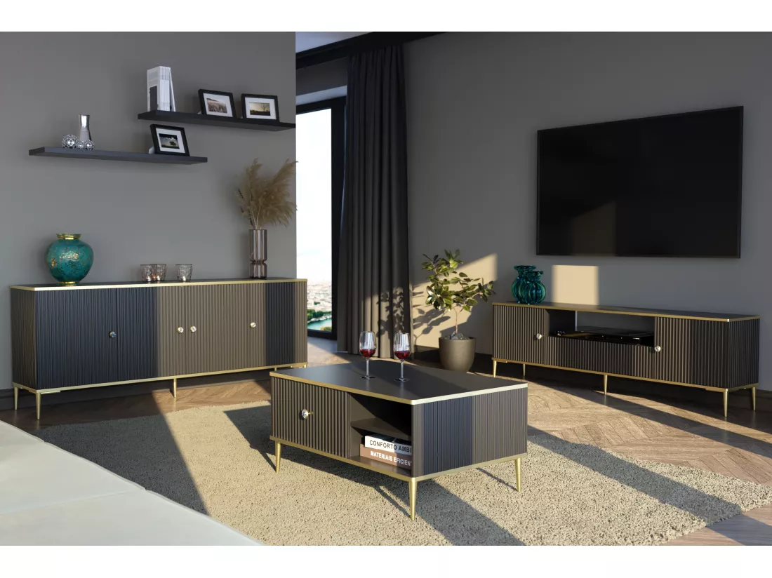 La collection PETRA est une proposition pour le salon qui mettra en valeur le caractère luxueux d’un intérieur glamour ou moderne. Il doit son aspect décoratif à un fraisage précis sur les façades et les côtés du meuble. Les accents dorés sous forme de pieds, de poignées et de bords en métal ajoutent non seulement de l’élégance et de la brillance à cette série, mais vous permettent également de créer un arrangement unique basé sur des couleurs classiques. Design décoratif allié au confort d’utilisation et à la fonctionnalité.