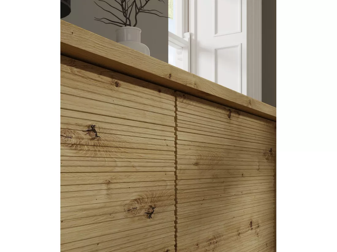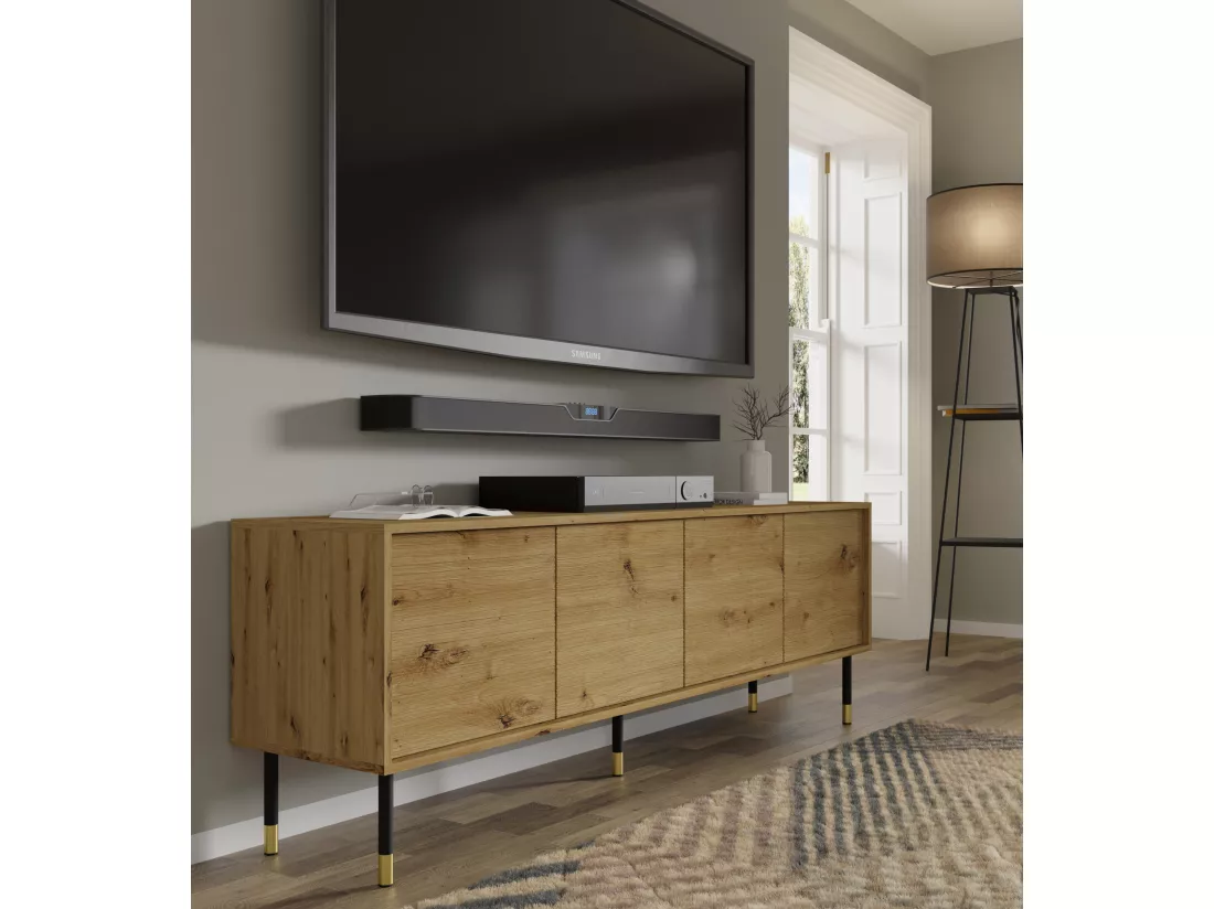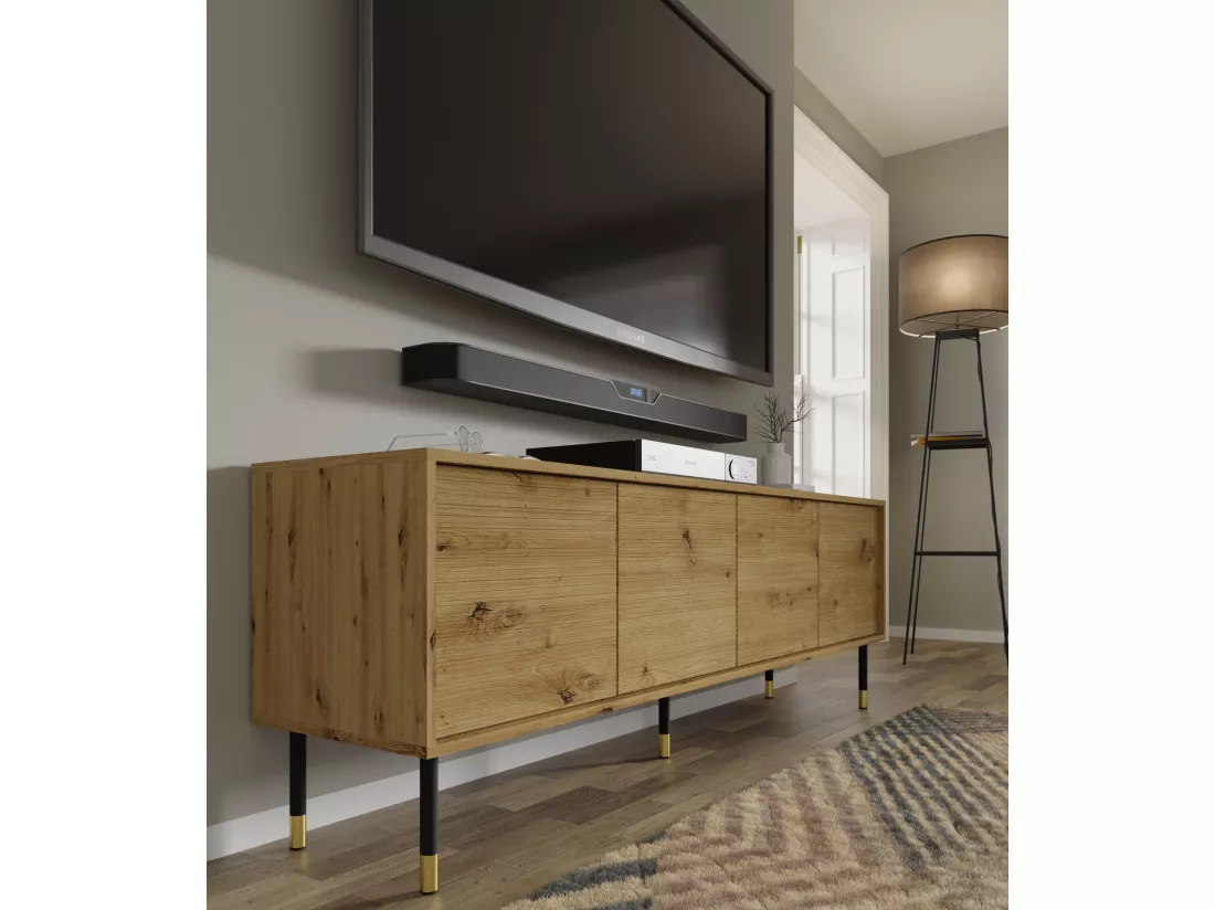 Sherwood offre non seulement un aspect unique, mais aussi un confort d’utilisation et un aménagement complet du salon. Dans la gamme, vous trouverez un meuble TV à quatre portes qui offre de l’espace pour les appareils électroniques et d’autres objets essentiels. Le large plateau peut être utilisé pour placer la télévision, le décodeur ou des accents décoratifs.